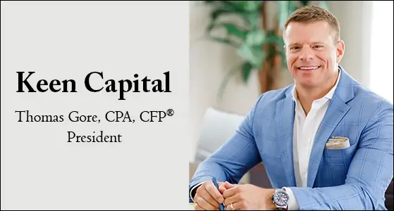 Thomas Gore is the Founder and President of Keen Capital, a Certified Public Accountant, and a Certified Financial Planner™ with a BS in Business Administration from Presbyterian College. He enjoys spending time with his wife, Edie, and their two daughters, McEwen and Mullins, as well as golfing and relaxing on Lake Murray.